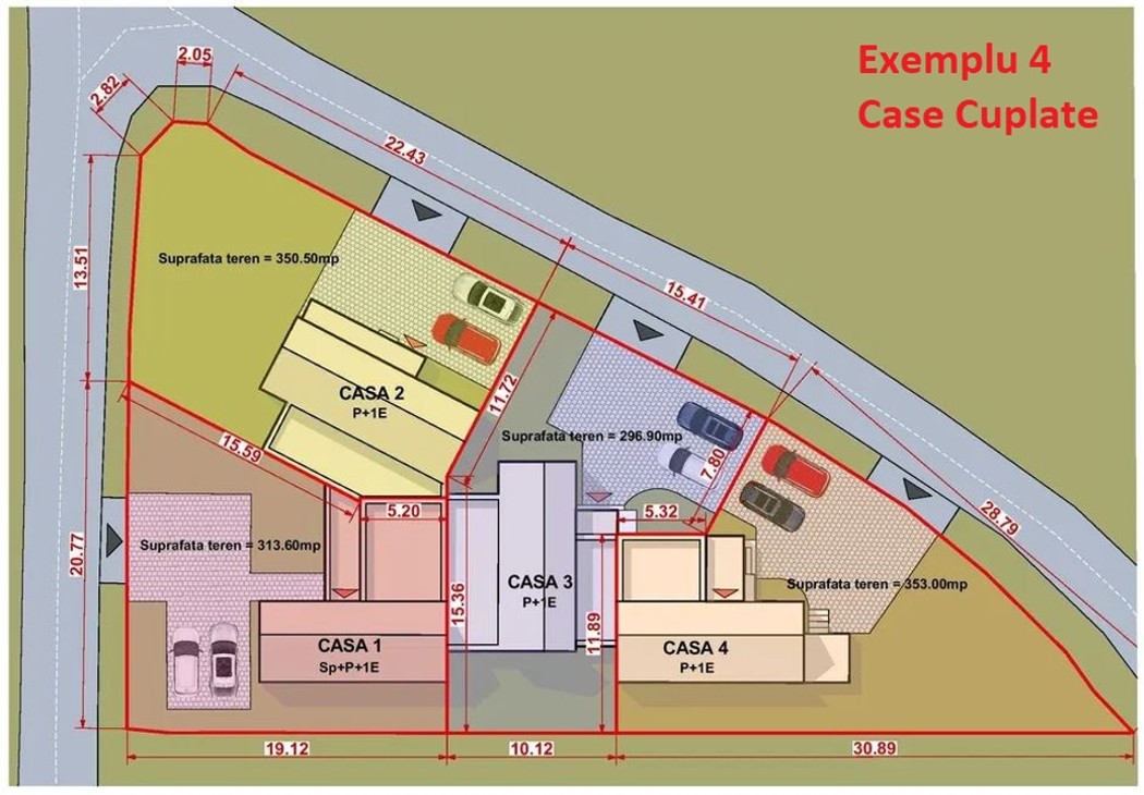Frontul la drumul asfaltat este de 14,8 metri iar latimea in partea de sus este de 28 metri.